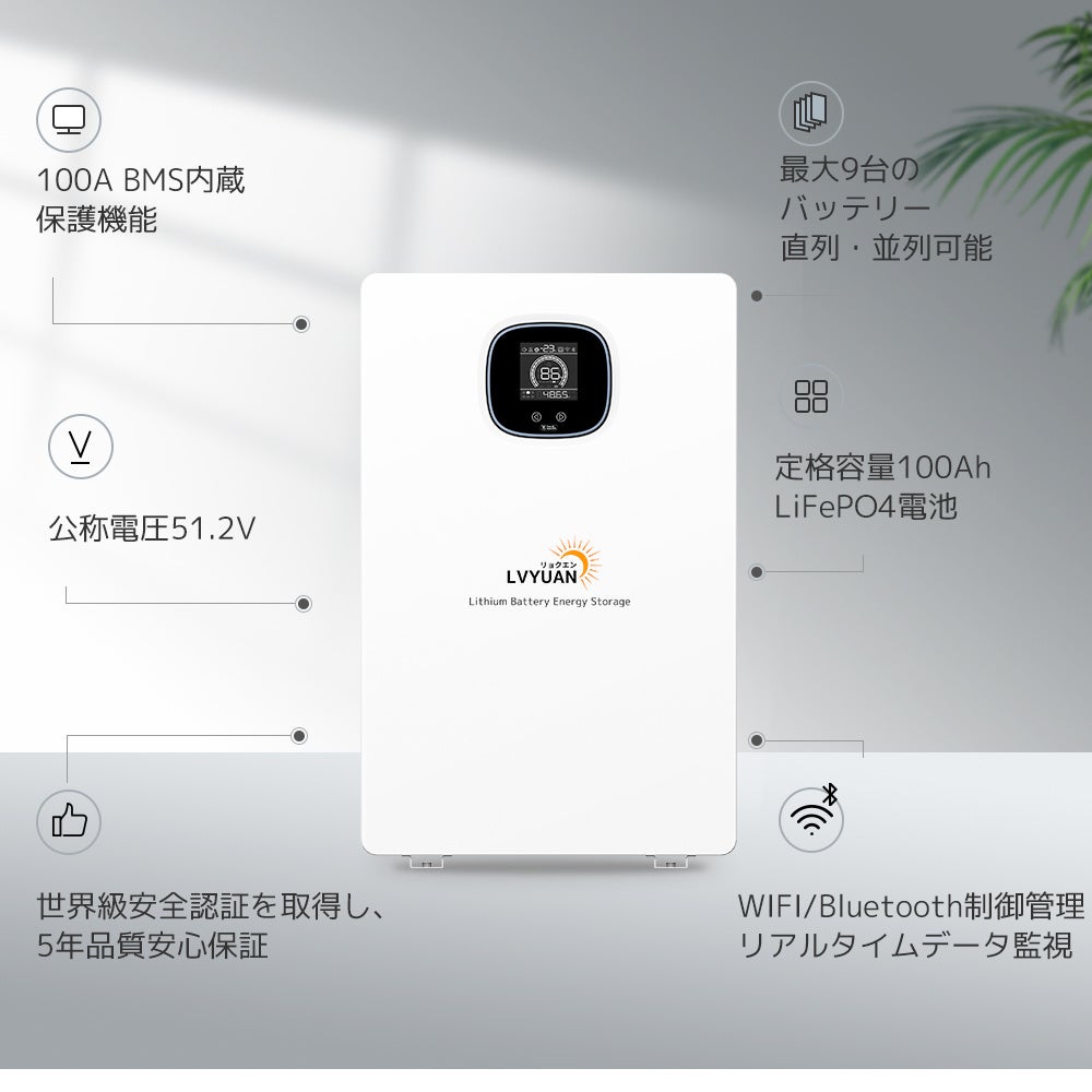 5.12kWhリン酸鉄リチウムイオンバッテリー:https://lvyuan.jp/collections/lithium-ion-battery/products/lifepo4-battery-5kwh