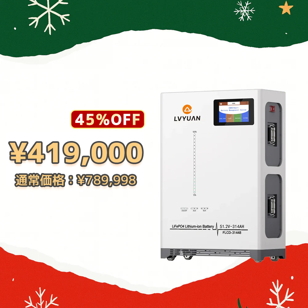 LVYUAN15.36kWhLiFePO4バッテリーは同じ大きさの鉛蓄電池の3~4倍のエネルギーを蓄えることができます。しかも、鉛蓄電池の重さのわずか1/3になり、取り付けも移動もより便利になります。4000サイクル以上の優れた寿命、約25年間使用できる長寿命です。放電深度が100%DODの状況で4000サイクルでき、1日に1回充放電しても10年まで使えます。放電深度によって、サイクル回数がもっと長くなれます、80%DODで6000サイクル、60%DODで15000サイクル実現できます。