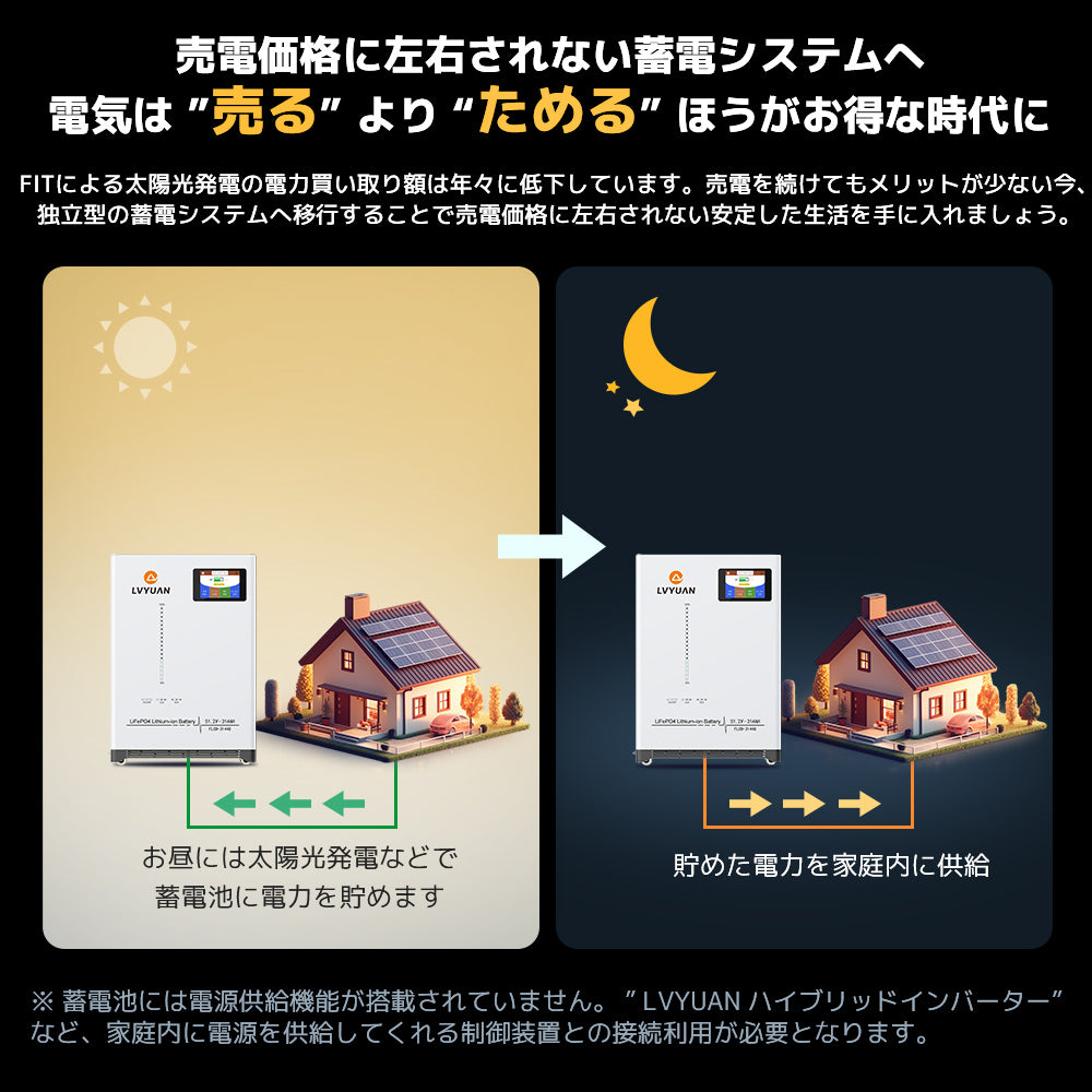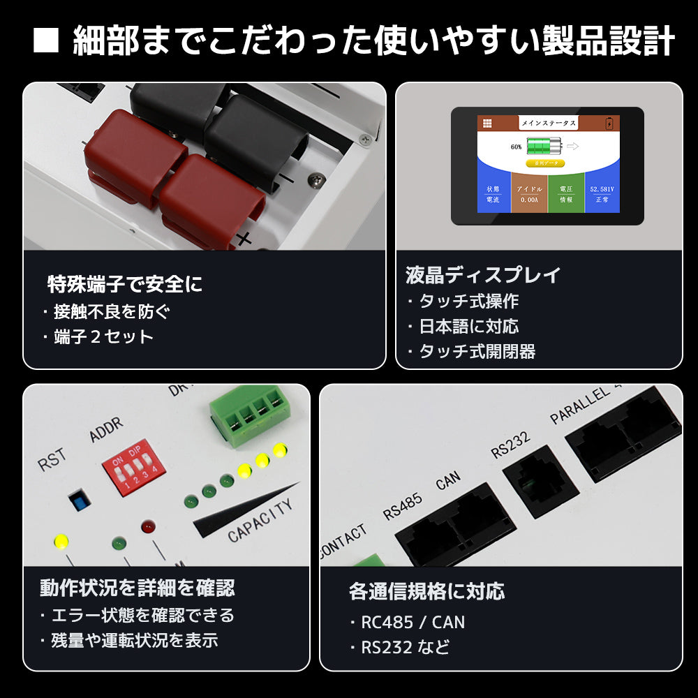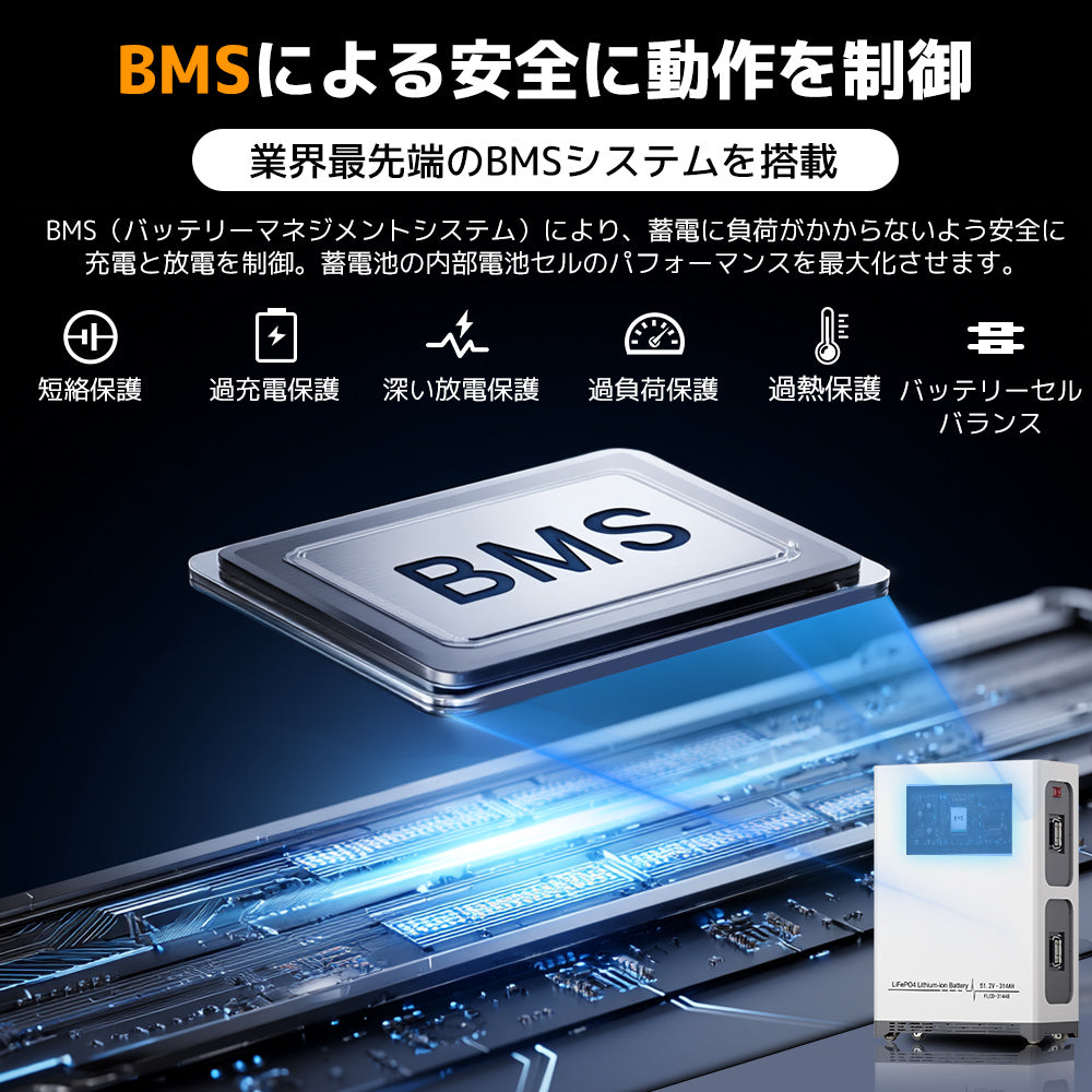 LVYUAN15.36kWhLiFePO4バッテリーにはBMS(バッテリー管理システム)が内蔵されており、自己放電率が低く、過充電、過放電、過電流、短絡からバッテリーを保護します。