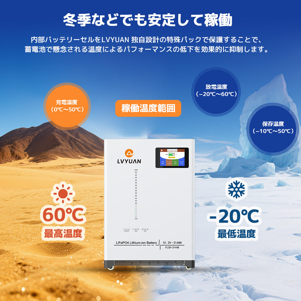 LVYUAN15.36kWhLiFePO4バッテリーは同じ大きさの鉛蓄電池の3~4倍のエネルギーを蓄えることができます。しかも、鉛蓄電池の重さのわずか1/3になり、取り付けも移動もより便利になります。4000サイクル以上の優れた寿命、約25年間使用できる長寿命です。放電深度が100%DODの状況で4000サイクルでき、1日に1回充放電しても10年まで使えます。放電深度によって、サイクル回数がもっと長くなれます、80%DODで6000サイクル、60%DODで15000サイクル実現できます。