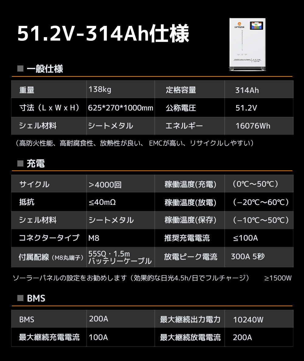 LVYUAN 51.2V / 300Ah 15.36kWhLiFePO4バッテリー内蔵200A BMS、高品質のグレードA LiFePO4セルを使用し、最大10000W 負荷電力、4000-10000 回サイクル & 25 年寿命、モジュール構造を採用して、60Kwhバッテリーパックに組み合わせることができます。エネルギー貯蔵ソリューションを求めるユーザーにとって理想的な選択肢です。