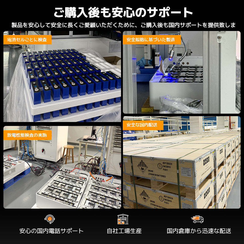 LVYUAN15.36kWhLiFePO4バッテリーは、厳格な国際認証であるIEC、UL、MSDS、UN、ENなどを取得し、優れた安全性が保証されています。厳正な基準により製造された高い品質のバッテリーセルである「Grade-A(グレードA)※」のみを採用し、高いパフォーマンスによりサイクル回数やセル寿命の向上を実現します。さらに、5年間の製品保証が提供されており、長期にわたり安心してご利用いただけます。
