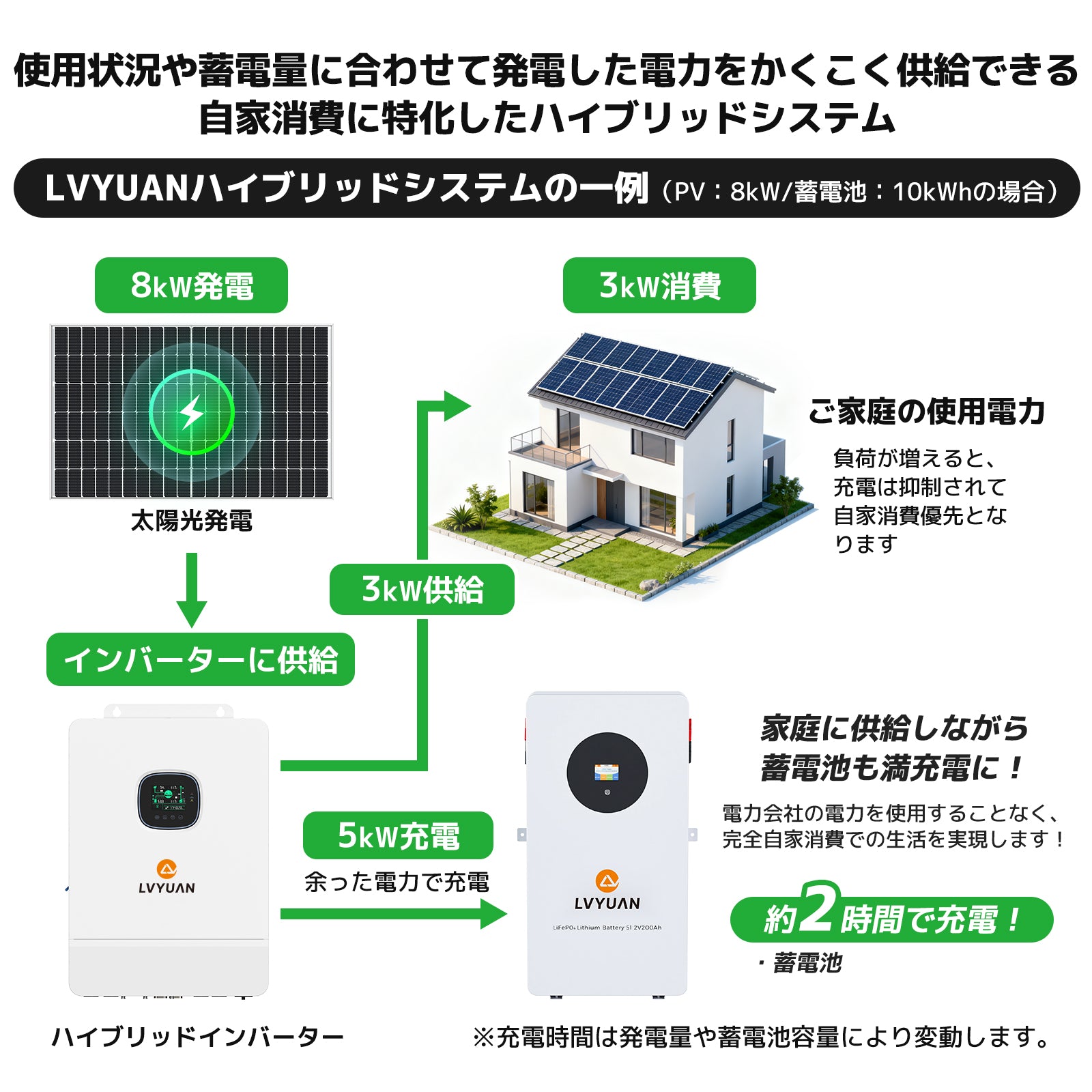 現在、LVYUAN社製6500W単相三線式ハイブリッドインバーターと10.24kWhリン酸鉄リチウムイオンバッテリー(両タイプ選択可能)、および410W単結晶ソーラーパネル(8枚)を組み合わせて、AC100V対応の単相三線式6.5KW蓄電システムを構築いただけます。