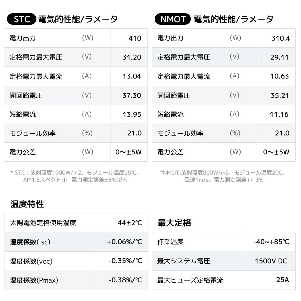 | ソーラーパネル | 410W 単結晶ソーラーパネル × 8枚 ・変換効率21%以上 ・IEC / TUV / IP68 認証 ・防水・防塵・耐塩害 ・25年リニア出力保証 |