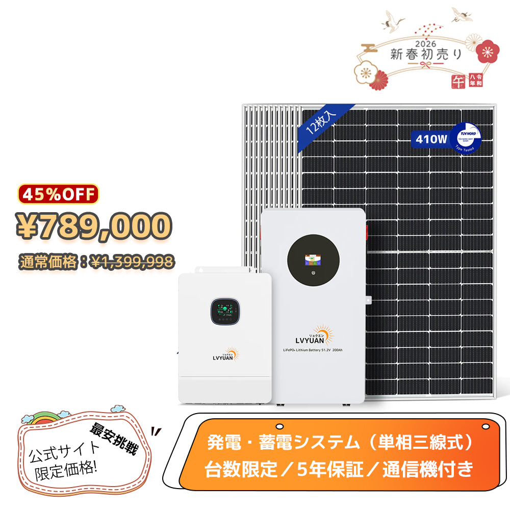 LVYUAN社製10000W単相3線式ハイブリッドインバーターとLiFePO4バッテリー (51.2V)、ソーラーパネル (410W)と共に利用いただくことでAC100v入力、単相三線式の蓄電・発電システムを構築できます。先進的な48Vバッテリーシステムを採用しており、高い安全性、エネルギー効率、汎用性、使いやすさが期待できます。太陽光で発電した電力および商用電源からバッテリーへ充電し、蓄えた電力を必要に応じて家電や設備へ供給することができます。本システムは UPS型ハイブリッドインバーターを基づいて、太陽光パネルおよび商用電源からバッテリーへ充電を行い、蓄えた電力を家庭内の機器へ供給することができ、配電網への逆潮流や売電機能は持たず、並列運転を行わないオフグリッド用途の装置 です。UPSと同様に停電時の非常用電源として安心してご利用いただけます。