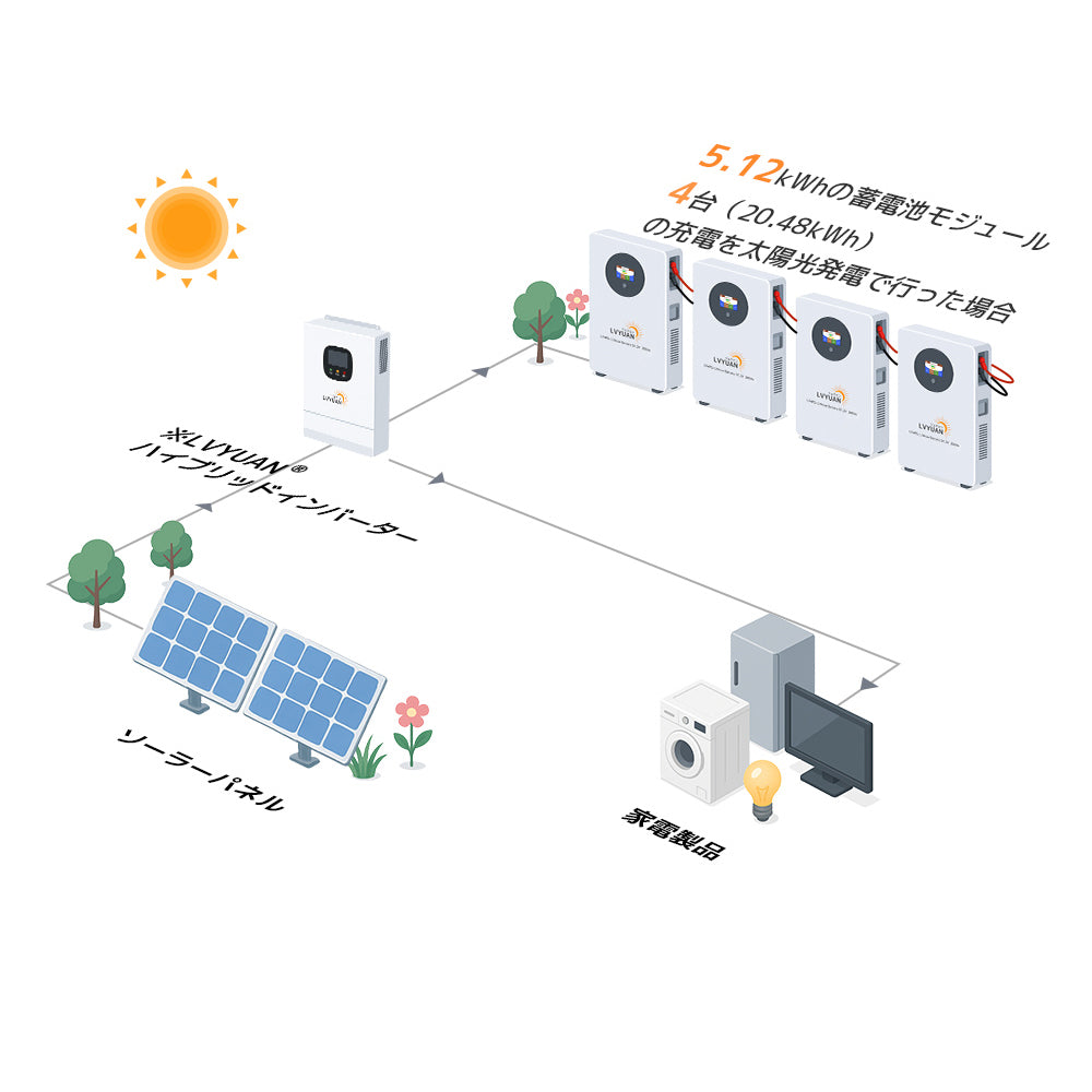 ハイブリッドインバーターとの接続で最大限の性能を発揮します。大型家電製品如電子レンジやエアコンなどを同時に動作させることも可能で、長期間の停電に備えており、電力の過剰消費を防ぐことができます。