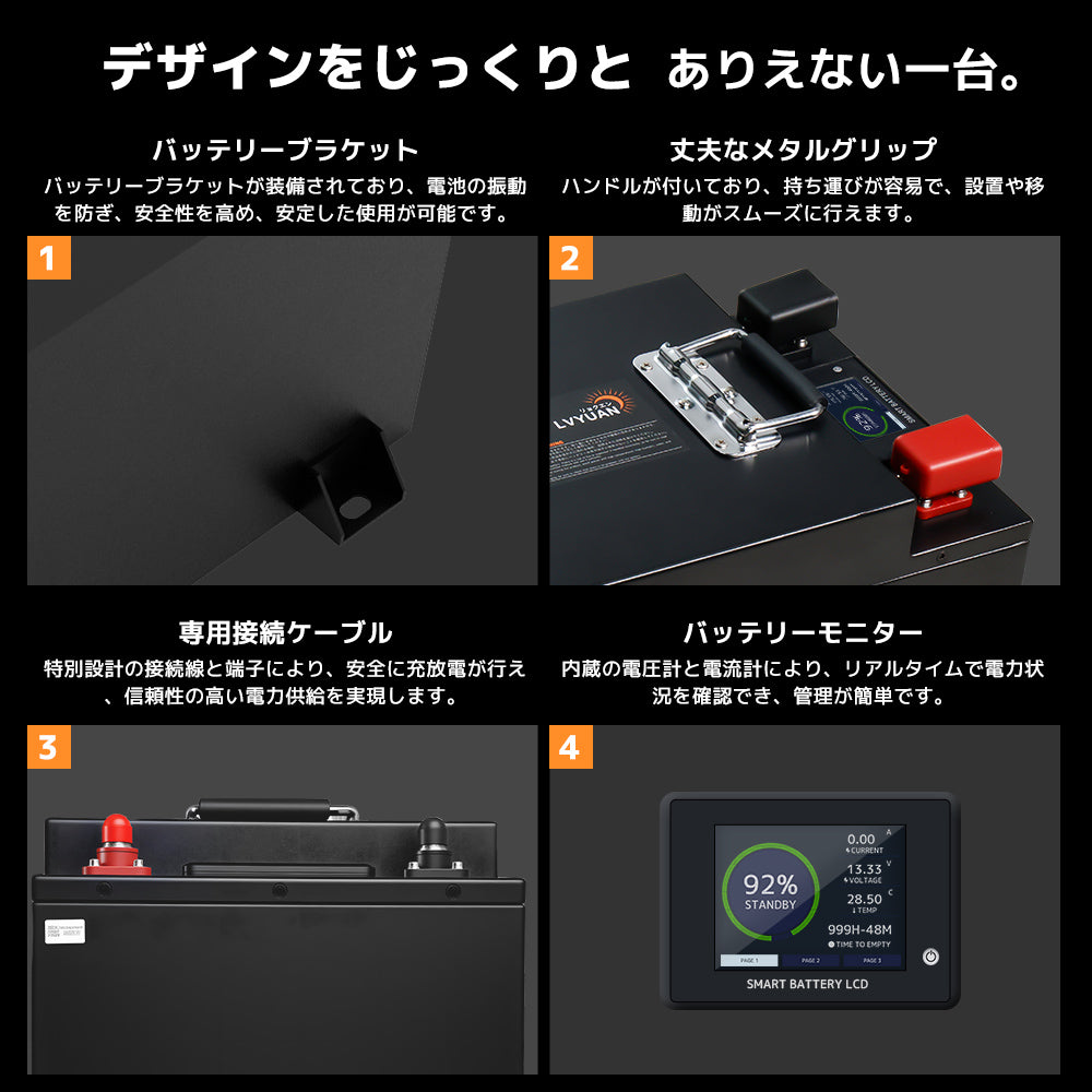 バッテリー前面にLCD液晶画面を搭載し、電圧・電流・容量・残量をリアルタイムで確認可能。さらにスマートフォンアプリと接続することで、電流・電圧・温度・サイクル寿命などの詳細データをチェックでき、いつでもどこでも安心・便利な管理を実現します。
