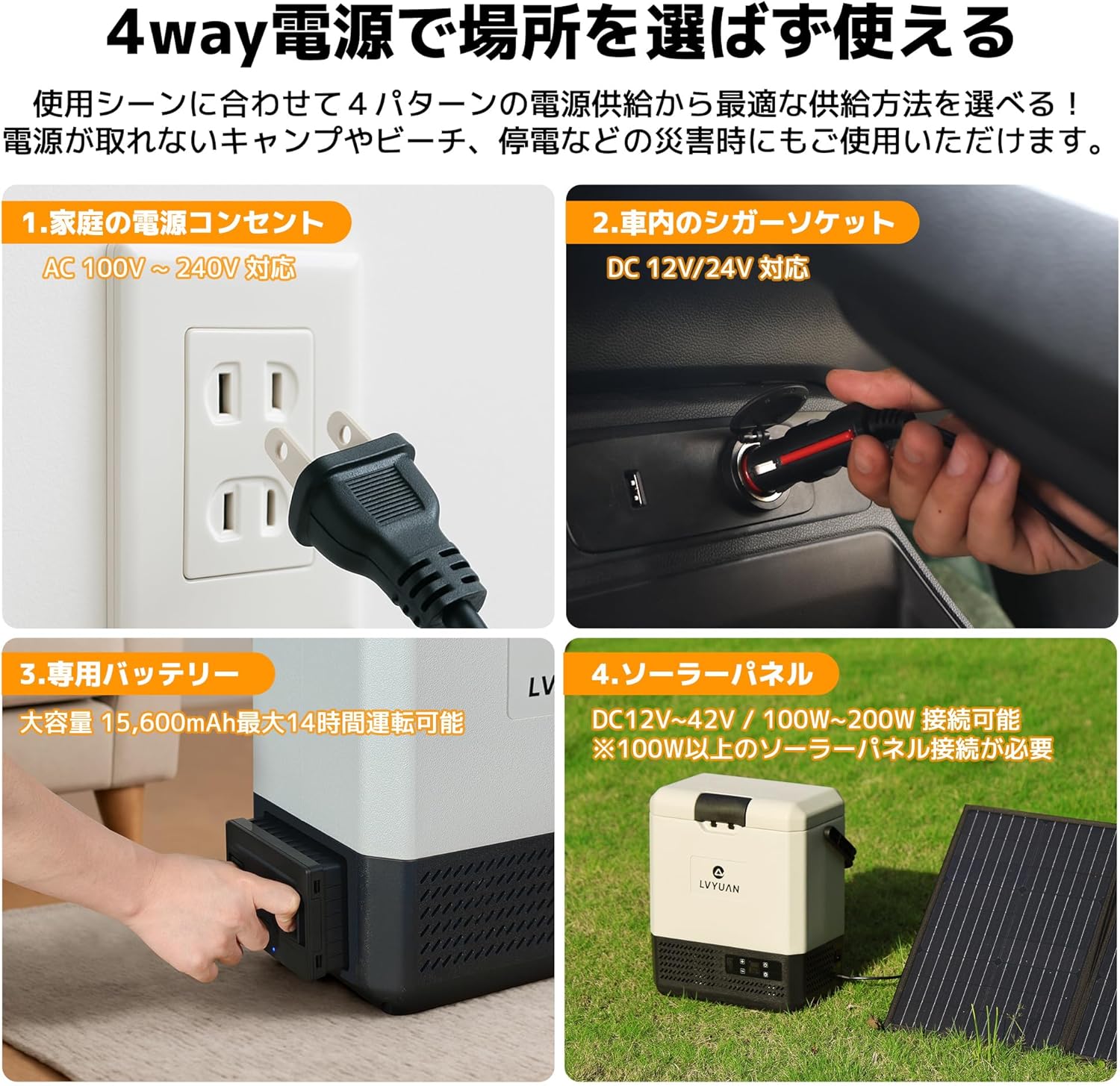 【家庭でも車内でも!】 AC電源(100V-240V)とDC電源(12V/24V)の両方に対応しており、室内はもちろん、軽自動車から大型トラックまでも幅広く対応可能。45dBの静音設計なので、寝室や車中泊時にも睡眠を妨げることはありません。