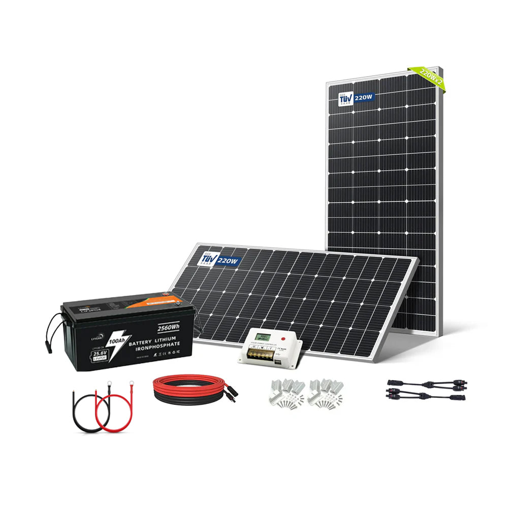 440Wソーラーパネル+PWMコントローラー+25.6V 100Ahリン酸鉄リチウム電池の本格独立電源セット本セットは、**高効率な220W単結晶ソーラーパネル×2枚(合計440W)**に加え、PWM 20Aチャージコントローラーと、大容量・長寿命の25.6V 100Ahリン酸鉄リチウムイオンバッテリーを組み合わせた、