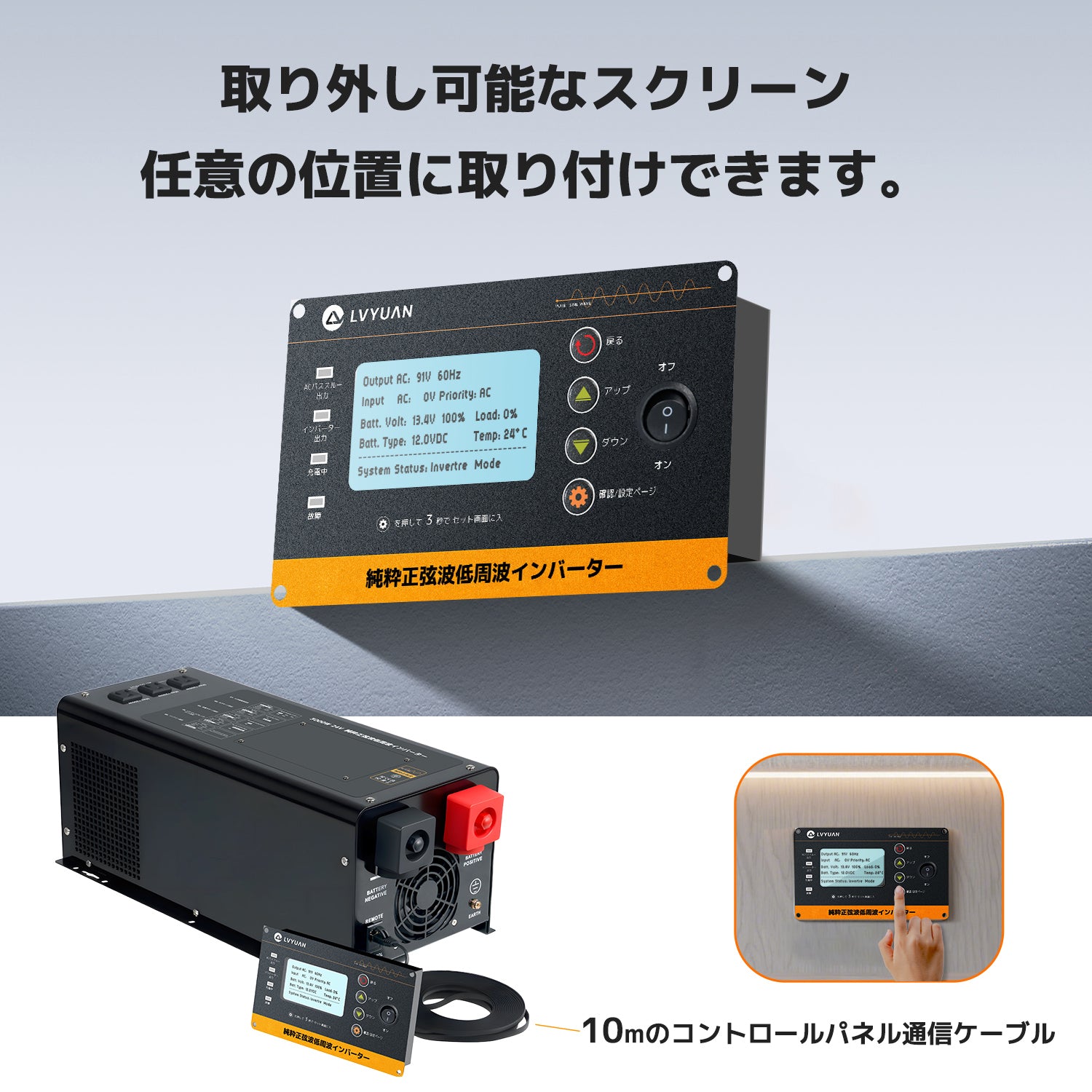 本セットの3000W UPSインバーターは、DC24Vのバッテリー電力を家庭用100V正弦波AC電源へ高品質変換。電子レンジ・冷蔵庫・PC・エアコンなど、精密機器にも安心して使用できる純正弦波出力を実現しています。